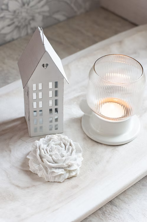 Dekorations ros med vitt glitter. Mått: ca 7-8 cm breda och ca 3,5 cm höga. Material: Mineralvitt