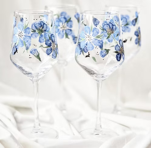 Ett set med fyra stycken handmålade vinglas.Höjd: 21.5 cmEndast handdisk!